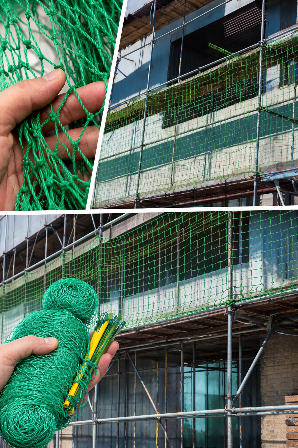 شباك حماية/احتواء الحطام: شبكات كثيفة ومقاومة تُستخدم لتطويق المنشآت أثناء الهدم أو إعادة التأهيل. تعمل هذه الشباك بكفاءة على التقاط واحتواء الأنقاض والغبار والحطام، مما يحمي المناطق المحيطة ويضمن السلامة العامة.